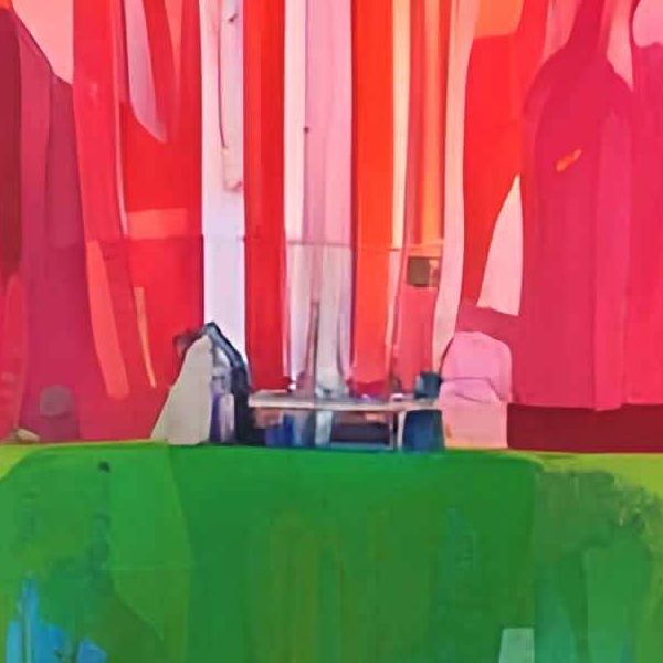 写実的な風景画が光や遠近で現実の空間を再現するのに対し,この絵は色と形の記号で場所の気配を作ります. 自然の緑は蛍光に近く,建物も具体名を失って記憶のかたちになっています. 幾何学的な配置は抽象画の構成感に近く,物語より感覚が前に出ます. 暖色と寒色の反発が明るさを保ちつつ,中心の赤が祭壇のような重心を与え,楽園と都市のあいだの夢の景色を感じさせます.