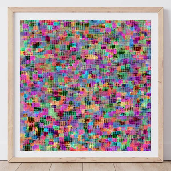 AI アートでは通常 A6 サイズ相当くらい (縦横 500〜1000 ピクセルくらい) の荒い画像しかつくれないので,超解像という技術をつかって原画より解像度を 4〜8 倍に (こまかく) しています. ただし,上の商品画像の解像度は原画以下なのでご注意ください.