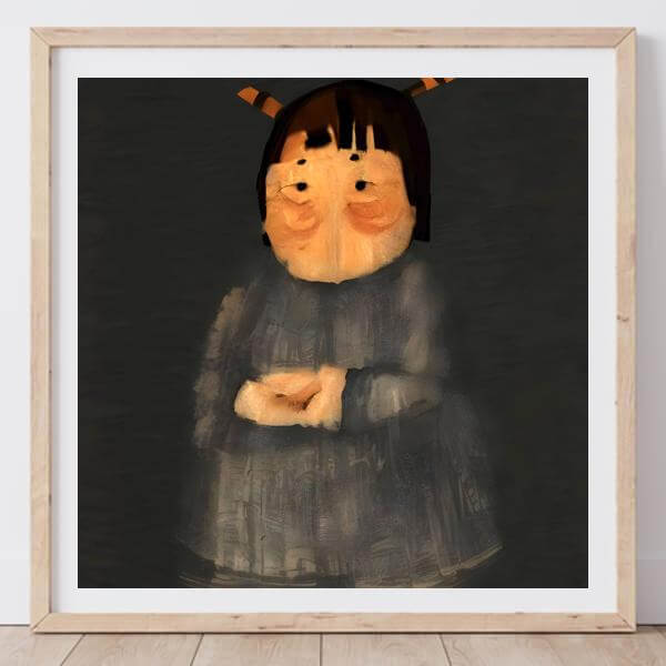 AI アートでは通常 A6 サイズ相当くらい (縦横 500〜1000 ピクセルくらい) の荒い画像しかつくれないので,超解像という技術をつかって原画より解像度を 4〜8 倍に (こまかく) しています. ただし,上の商品画像の解像度は原画と同程度なのでご注意ください.