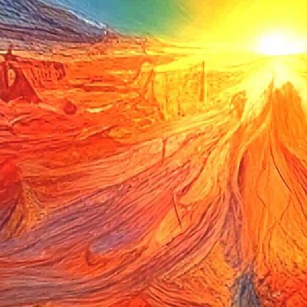 この作品は渦巻くような厚い筆致と,燃えるような赤から深い藍へと移ろう強烈な色彩で視線を中央の球体へと誘導します. 地平から差し込む黄橙の光が画面に奥行きを与え,流れるような色面の重なりが時間とエネルギーの動きを暗示します. 見る者は炎と宇宙が同居する異界へ引き込まれるような感覚を覚えることでしょう.