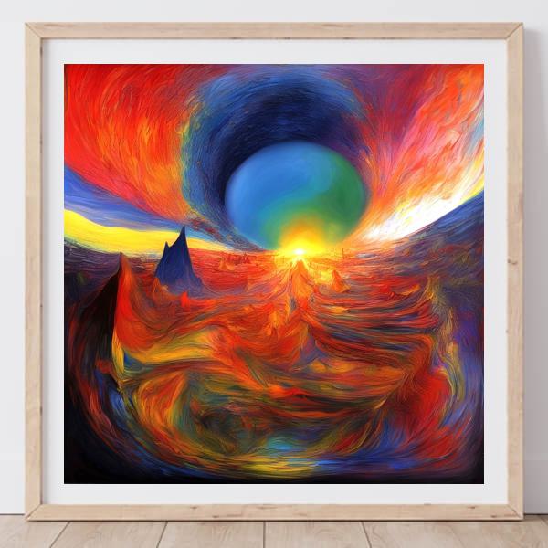 制作表現にはフィンセント・ファン・ゴッホの渦巻く筆触表現やJ.M.W.ターナーの光と色の叙情性,さらに抽象表現主義に見られる大胆な色面構成の影響が感じられます. 中央の球体はシュルレアリスム的な象徴性を帯び,具象と抽象を往還することで多様な解釈を喚起します. ウェブ上では発色のニュアンスを損なわない画像で紹介すると,作品の躍動感がより伝わります.