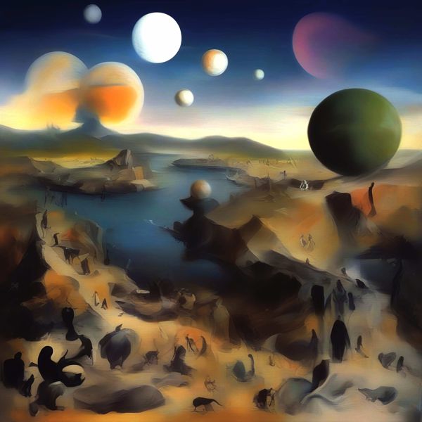 これらの画像は通常の AI アートとはちがう独自の方法を使って作っています. AI アートは AI にプロンプト (または呪文) とよばれる英語の記述をあたえて作画した画像ですが, Stable Diffusion,DALL・E 2,Midjourney などの AI プログラムによって 2022 年に爆発的に普及しました. AI アートで望む画像を作るために通常は比較的細かい指示を与えます. しかしデイシンではおもに 1〜4 語程度の短いことばや造語を Stable Diffusion XL 1.0 (1024) を使用している OpenArt,NightCafe などのウェブサイトで使用して,そのプログラムがもつ知識をいかして自由に (ジェネラティブに,創発的に) 画像をつくらせています. コントラストの調整等はしていますが,描きなおさせたり加筆したりするようなことはしていません.