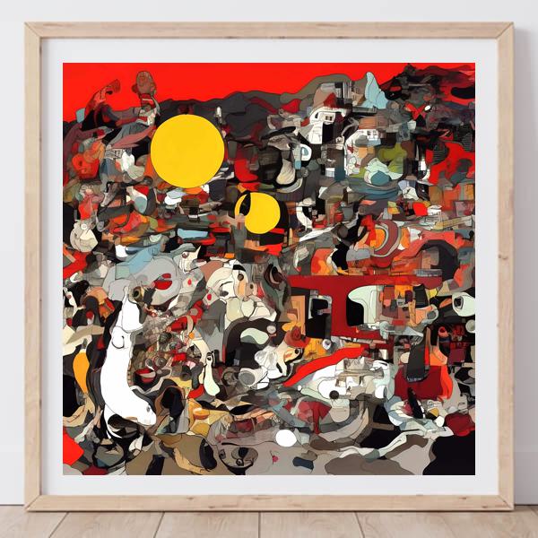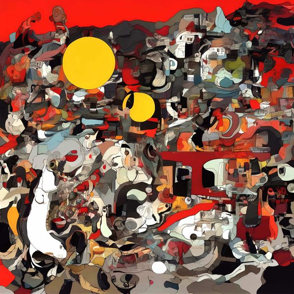 制作者と AI (AI アート作成用のプログラム Stable Diffusion XL 1.0 (1024)) とからなるアートユニット カナブストラクド によるアート画像です.そのプログラムに「Kanabstracd absurdism Miró」ということば (prompt) をあたえて創造させました. 負のプロンプトとして「Miró」を指定しています.