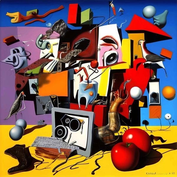 制作者と AI (AI アート作成用のプログラム Stable Diffusion XL 1.0 (1024)) とからなるアートユニット カナブストラクド によるアート画像です.そのプログラムに「Kanabstracd contemporary surrealism」ということば (prompt) をあたえて創造させました. 負のプロンプトとして「surrealis」を指定しています.