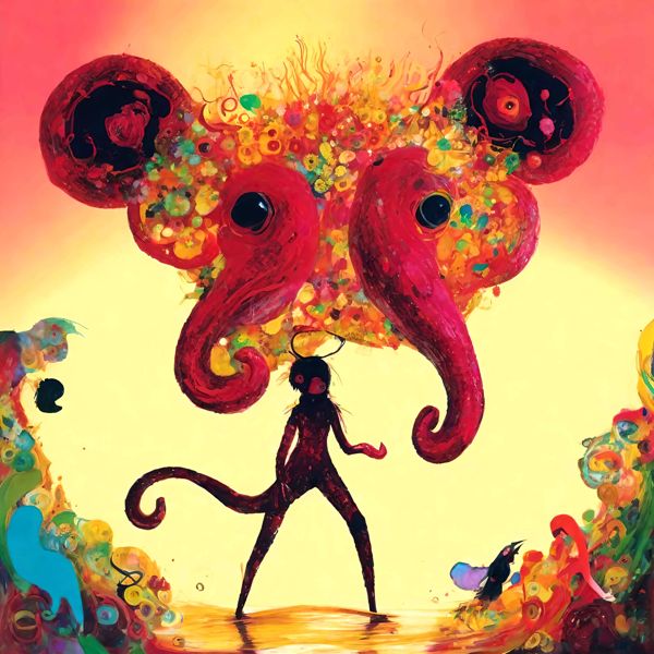 これらの画像は通常の AI アートとはちがう独自の方法を使って作っています. AI アートは AI にプロンプト (または呪文) とよばれる英語の記述をあたえて作画した画像ですが, Stable Diffusion,DALL・E 2,Midjourney などの AI プログラムによって 2022 年に爆発的に普及しました. AI アートで望む画像を作るために通常は比較的細かい指示を与えます. しかしデイシンではおもに 1〜4 語程度の短いことばや造語を Stable Diffusion XL 1.0 (1024) を使用している OpenArt,NightCafe などのウェブサイトで使用して,そのプログラムがもつ知識をいかして自由に (ジェネラティブに,創発的に) 画像をつくらせています. コントラストの調整等はしていますが,描きなおさせたり加筆したりするようなことはしていません.