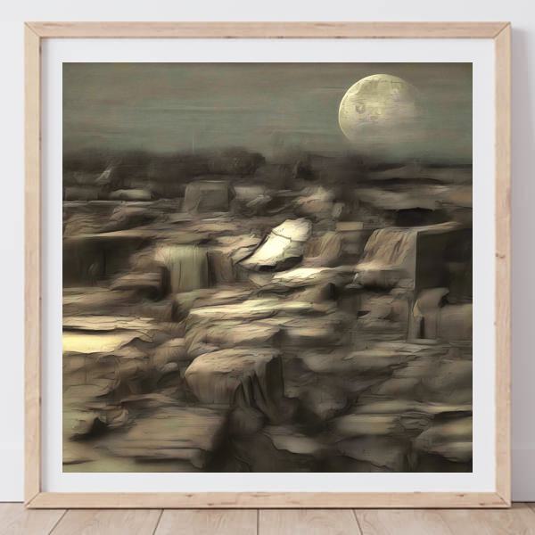 AI アートでは通常 A6 サイズ相当くらい (縦横 500〜1000 ピクセルくらい) の荒い画像しかつくれないので,超解像という技術をつかって原画より解像度を 4〜8 倍に (こまかく) しています. ただし,上の商品画像の解像度は原画以下なのでご注意ください.