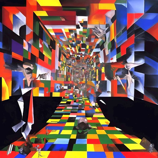 制作者と AI (AI アート作成用のプログラム Stable Diffusion XL 1.0 (1024)) とからなるアートユニット カナブストラクド によるアート画像です.そのプログラムに「Kanabstracd surrealism Delaunay」ということば (prompt) をあたえて創造させました. 負のプロンプトとして「Delaunay ovals」を指定しています.
