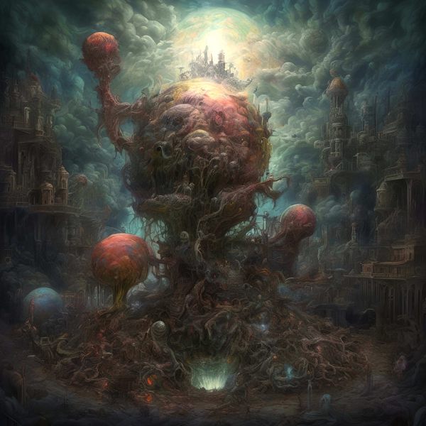 制作者と AI (AI アート作成用のプログラム Stable Diffusion XL 1.0 (1024)) とからなるアートユニット カナブストラクド によるアート画像です.そのプログラムに「Kanabstracd fantasy absurd_realism」ということば (prompt) をあたえて創造させました. 負のプロンプトとして「bows」を指定しています.