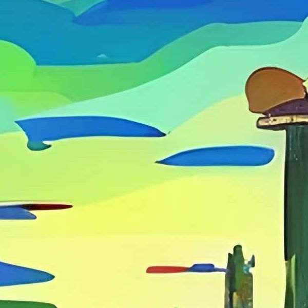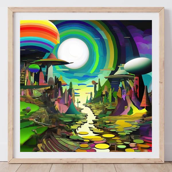 造形や色使いにはワシリー・カンディンスキーの抽象的な色面表現,サルバドール・ダリの夢幻的な超現実主義,ジャン・ジロー(モービウス)に通じるSF的都市構成の影響が感じられます. デジタル合成を思わせる整然とした筆致と遊び心ある細部描写が観る者の想像力を刺激する一作です.