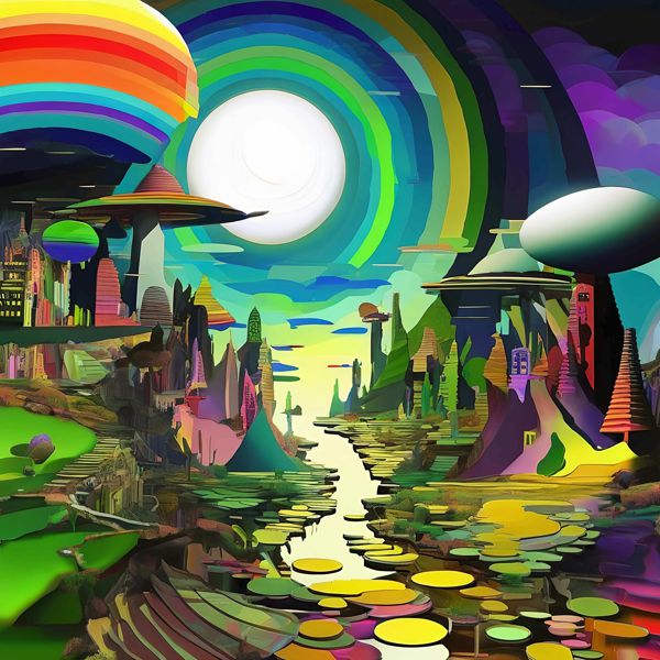 この作品は,同心円状に重なる光輪と大きな白い月を背に,宙に浮かぶ平台や尖塔群,鏡面のように広がる水面が連なる色鮮やかな異世界の風景です. 虹色の階層と平面的な色面がリズムを生み,鮮烈な対比と滑らかなグラデーションが幻想的で近未来的な印象を与えます.