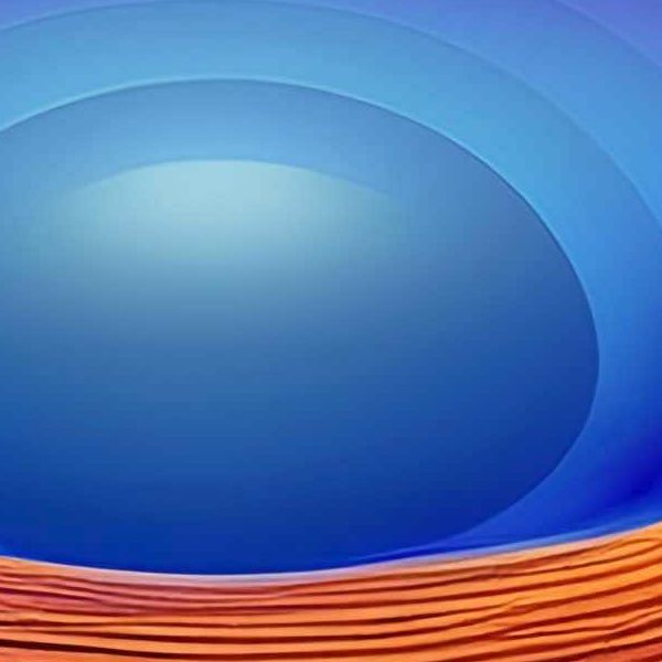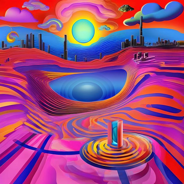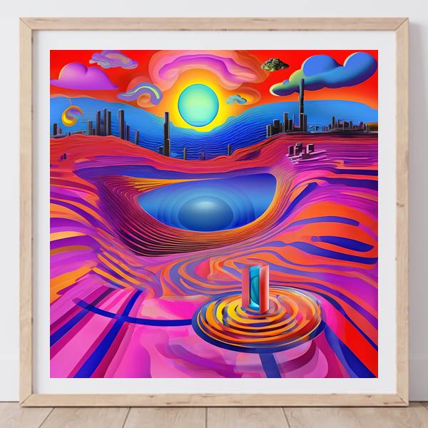 本作は鮮烈な彩色と層を成す地形的ラインで構成された幻想的な風景画です. 中央の深い窪みと光を帯びた球体を軸に,波打つ縞模様と滑らかなグラデーションが視線を誘導します. 遠景の都市シルエットや浮遊する雲が配され,現実と夢の境界を曖昧にする構成になっています.